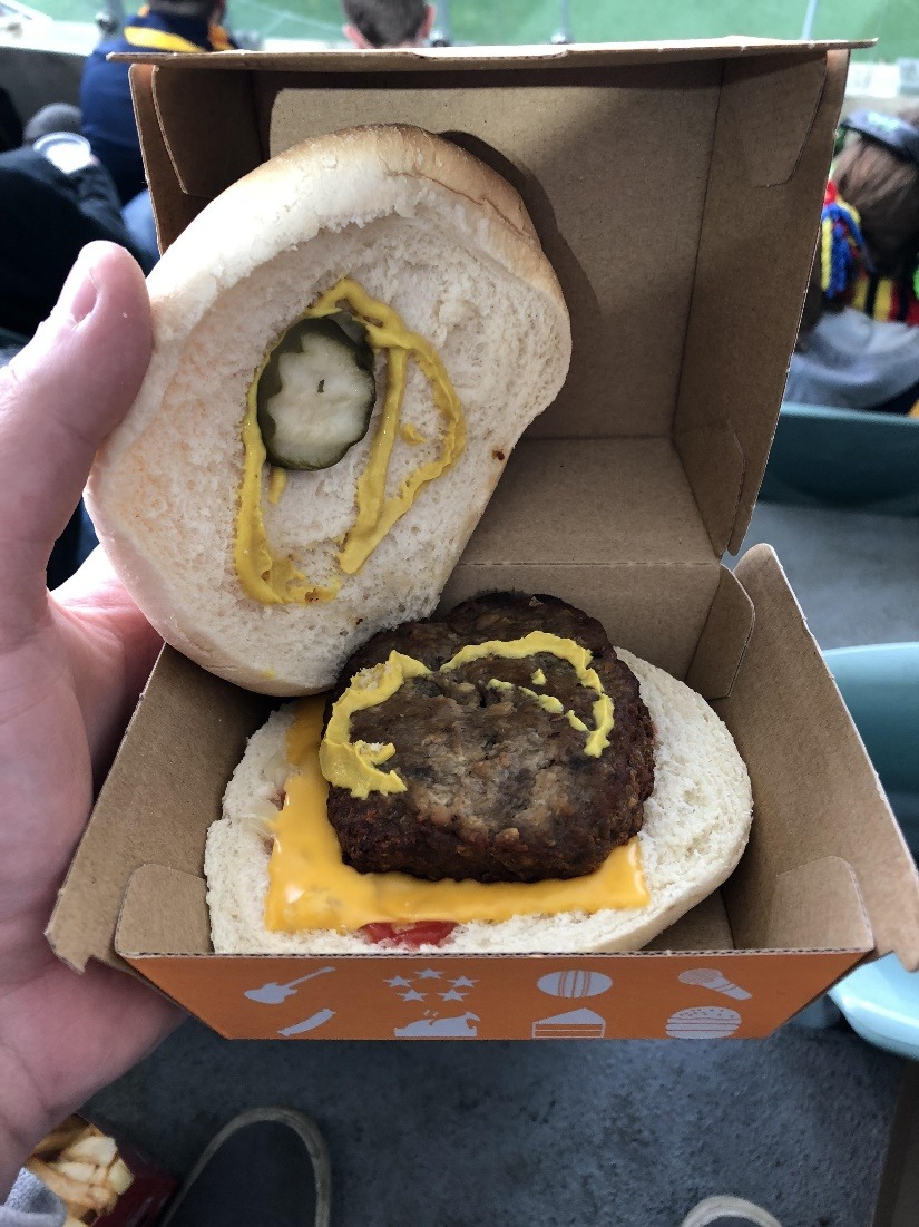 The individual paid $10 for a burger that lacked sauce. It had just a solitary tomato and the patty did not adequately cover the entire bun. All in all, this burger is unappetizing and unsatisfying, particularly considering its $10 price tag. This serves as a reminder to never have high expectations when it comes to stadium food offerings.