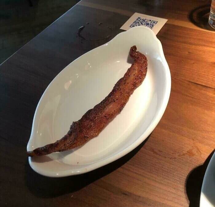 At restaurants, it is quite common for individuals to request an additional item to their order. In the case of the individual in the photograph, they specifically ordered bacon that was priced at $6, leading them to anticipate a greater amount of this particular dish. Regrettably, their expectations were let down as they were only presented with a petite portion of bacon, leaving them feeling immensely disappointed.