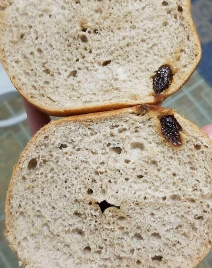 Cinnamon bagels are traditionally made without any added ingredients and are expected to be plain. However, this particular batch went against the norm and contained two raisins. The individual who discovered the raisins when they opened the bagel was surprised and momentarily believed they had mistakenly purchased a raisin bagel. Ordinarily, this situation would not cause concern as the raisins could easily be removed.