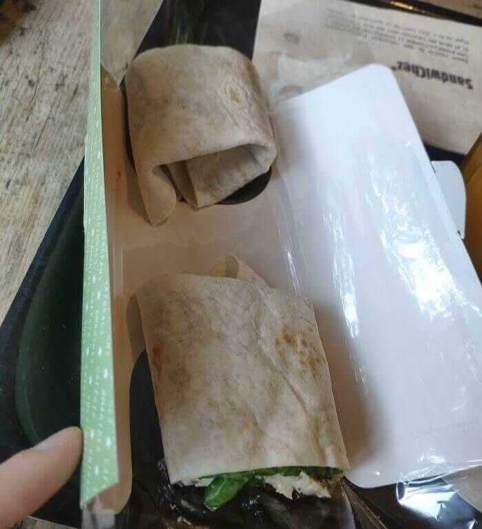 Upon initially laying eyes on the burrito, the individual who made the purchase was under the impression that it would satiate their hunger as a result of its considerable length. However, it wasn’t until the packaging was opened that they became aware of the fact that the burrito was not intact. Instead, it had been divided into two sections and positioned at the outer edges, thus omitting the central portion that would have given it its elongated appearance.