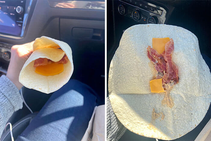 A lot of people enjoy buying wraps for breakfast or lunch due to their quick and satisfying nature. Unfortunately, this individual had a very disappointing experience when they discovered that their wrap was barely filled, not even reaching a quarter of its length. They specifically requested for the egg not to be included.