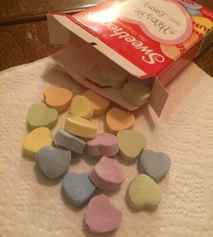The conversation hearts were meant to display sweet messages, but unfortunately, they are completely blank. On top of that, the hearts themselves are not well-formed. This highlights the importance of not buying or gifting something unseen. However, the person who received them found humor in the situation and shared a photo, which brought some amusement.