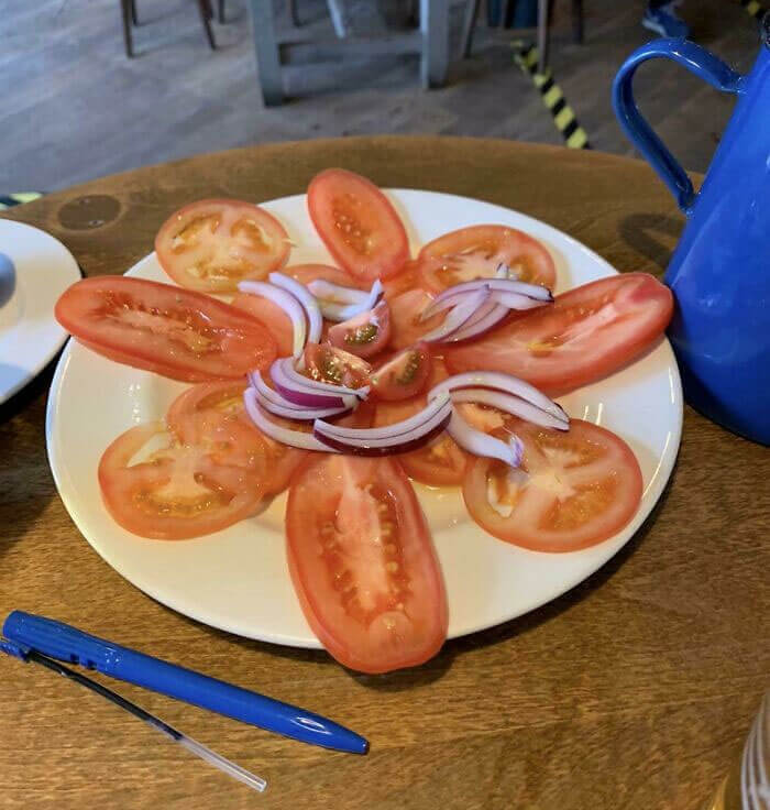 This salad aims to take advantage of customers who prioritize healthy options over fast food by offering a pricier alternative. It is worth noting that one can easily slice tomatoes at home and enjoy them for free. However, it’s commendable that the restaurant made an effort to include two distinct types of tomatoes.