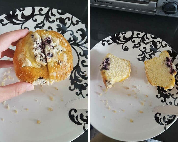 Nevertheless, upon slicing the muffin into two equal parts, the individual discovered the absence of any blueberries within. Furthermore, the delicacy was devoid of cream, causing disappointment for the customer. This highlights the importance of not making purchases solely based on appearance.
