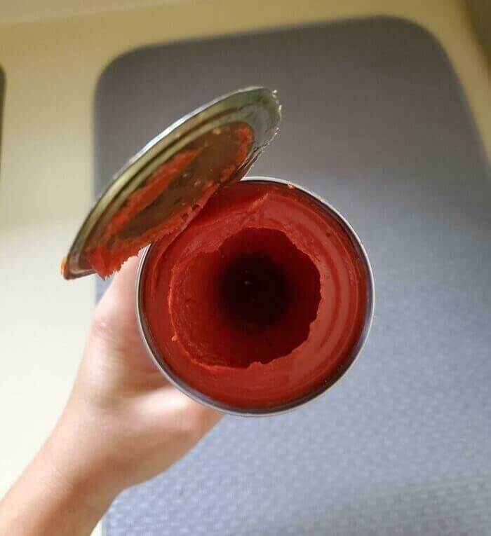 We were completely caught off guard and truly surprised by this unexpected food mishap. Normally, a can of tomato paste is filled completely up to the top. However, this particular can breaks all conventions by having a large hole in the middle that goes all the way to the bottom of the tin.