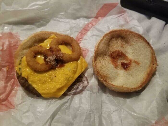 Certainly, the burger appears to be dry and small in the end. Even the onion rings appear smaller than they typically would. All we can do is wish you luck in avoiding such dishonest practices.
