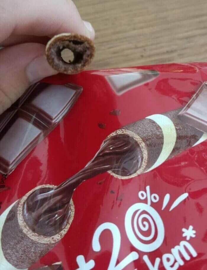 Here is another example of excessive packaging that has fooled numerous individuals throughout the years. The packaging of the wafer roll gives the appearance of a gooey, melted chocolate filling. Nevertheless, in truth, the filling is actually dry and does not contain the same quantity. In reality, the actual wafer rolls have a void in the center.