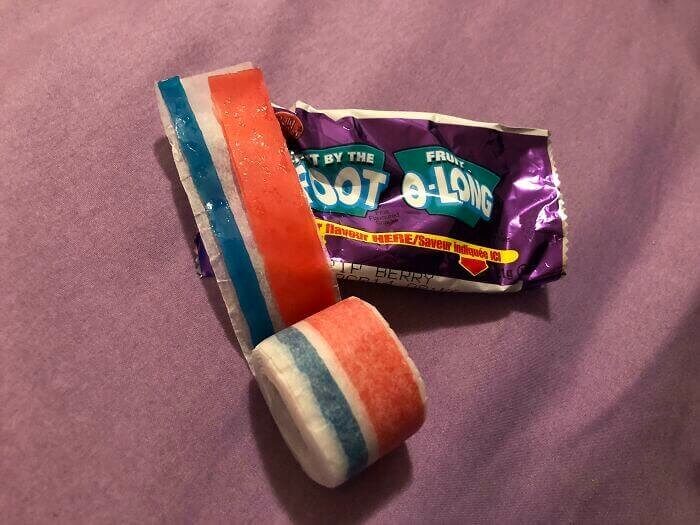 Nevertheless, an error was made during the manufacturing process where the two strips were created separately. It is worth noting that this particular brand of snack enjoys a significant level of popularity, causing us to feel doubtful that they would commit such an amateurish oversight. Furthermore, we are also curious as to whether the candy truly measures one foot in length as indicated on the packaging.