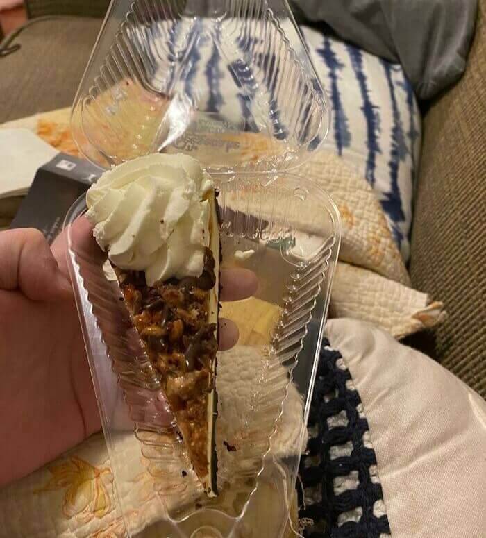 In general, cake slices are usually large triangles that occupy the majority of the area within this type of plastic container. The individual who purchased this sweet treat was either deceived or had a very strong desire for it.